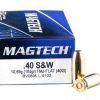 Magtech’s .40 S&W load is ideal for target shooting and range practice. The round fires a 180-grain full metal jacket projectile at a muzzle velocity of 990 feet per second. This combination results in normal ballistic performance at pistol ranges with slightly gentler recoil than the .40 Smith & Wesson is typically known for. If you like shooting for extended, high round count sessions or simply experience recoil sensitivity, this load might be a good choice.