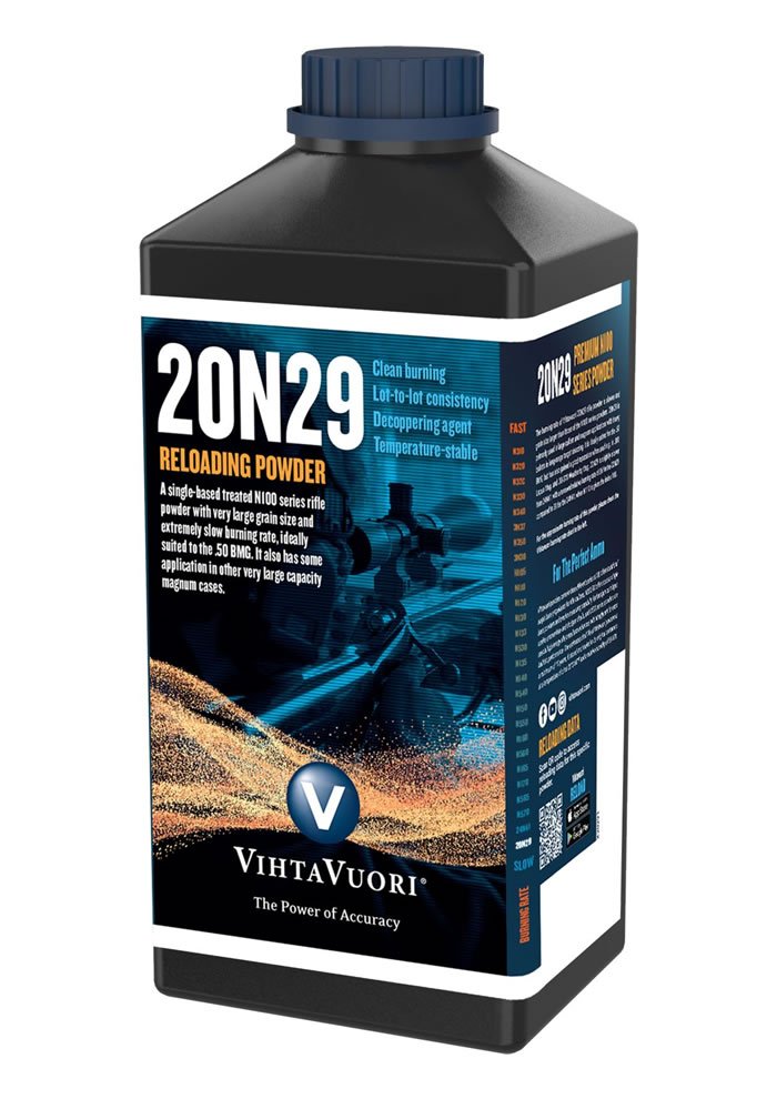 The N100 powders are single base powders that are mostly utilized in rifle calibers. This Vihtavuori rifle powder was designed for.50 BMG and military usage, and the term 20N29 is derived from Finnish Army specifications. Vihtavuori 20N29 Powder is a surface-treated single-based powder having grain size of 2.33 mm length and 1.33 mm diameter.