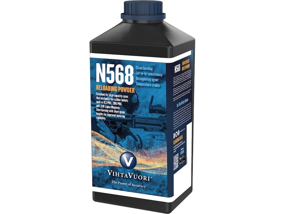 The exceptionally constant metering that Vihtavuori N568 Powder provides for long-range competition shooters, accuracy aficionados, and hunters in general is made possible by its slow burning characteristics and shortcut grains. Vihtavuori N568 Powder performs very well with heavy-for-caliber bullets, has great temperature stability, and is insensitive to changes in relative humidity. An outstanding option for traditional belted magnum cartridges including the 7mm Remington Magnum, 300 RUM, 338 Winchester Magnum, and many more.